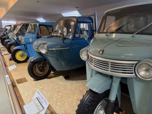乗用車以外の、トラックは全体の中では少なめだけどオート三輪は10台以上は展示。自動車工業の発展の中でオート三輪が重要だったという位置付けかもしれません。バーハンドル付きも、円形ハンドルも、幌屋根、金属キャビン。などいろいろ。