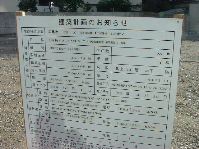 西区天満町の「星光堂」が入っていたビル跡(広島市西区天満町 15-7)はどうやら14階建てマンション(26戸)になるようです。 2008年春完成予定。ネットで調べると星光堂の広島支店は南区稲荷町に移ったようですね。西に向かう市内電車がそこで南に曲がる場所で、 少し気になっていた場所なので写真をとってみました。