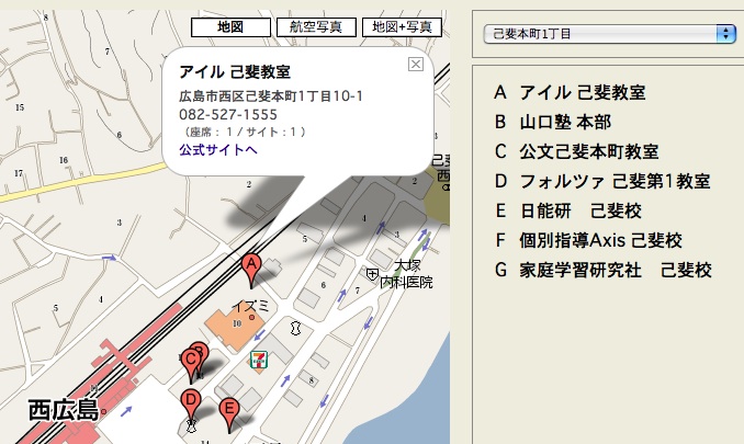 広島市西区己斐本町の主な塾の一覧を作りました。己斐本町の塾、地図版と文字版です。己斐本町のJR西広島駅付近は学習塾が多くて、ここ5年でも空き店舗の場所に新しい塾が(カメラ店の跡に塾、など)入っている様子です。塾事情について何度か人にきかれたので今日は塾一覧を作りましたが例によって全部の塾をのせようとすると数がすごく多いので主観で選んだ主要なものだけにしました。(追加希望はコメントくださればなんとか対応します)新聞広告とか目に付いたビルとかで見覚えのある塾をのせて、サイトURLもつけてみましたが、比較的大きな塾はみなウェブサイトを運営しています。塾の比較は昔も今もクチコミ中心の感じですが、それでもネットで調べたい事もあるでしょう。塾によっては「あとセンター試験まで63日!」とか日替わりで(自動)のせているサイトもあります。20年前にくらべると「個別指導」を看板にした、教師一人に生徒2,3人という形式の塾は増えたような気がします。なお参考にe-塾選びという塾比較の専門サイトもありました。(地図の表示はGoogle Maps API + KsGMapです)