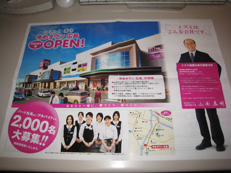 少し遅れて知りましたがHIROSHIMA PRESSの記事と日経ネットの記事によると、広島市南区皆実町に2008年2月に開業するショッピングセンター「ゆめタウン広島」の概要、が11月1日に発表されたようです。「紀伊国屋書店の大型店舗を含む百八十の専門店が出店」という所が面白そうです。なぜか7日の時点ではイズミ公式サイトにはその詳細が無いのが残念です(株主へのお知らせがちょっと不足?)。調べてみるとフロンティア不動産の資料(PDF書類)5ページに、おおまかな図面がありますが今のルネサンス広島の北側の部分、日本たばこJTの工場跡がぜんぶ、ゆめタウンになるような印象です。泉開発株式会社の資料にゆめタウンの完成予想図と工事前の航空写真がありました。その他正社員アルバイトの募集要項、Wikipediaの、ゆめタウン広島記事もあります。なお、おまけでひろしまドリミネーション2007(平和大通りの照明)は11月17日スタートのようです。