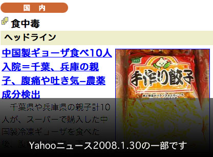 27日の日記で「手作りは信仰か…」を書きましたが、今日のニュース記事中国製冷凍ギョーザで食中毒、千葉と兵庫で3家族10人を写真で見ると、偶然ですが冷凍食品の名前が「手作り餃子」というのが目につきました。この際問題は手作りかどうかじゃなくて毒物が入っている点なんですが。100人に一人くらいは「手作りだから安心」とか連想した人がいるのかなと想像しています。