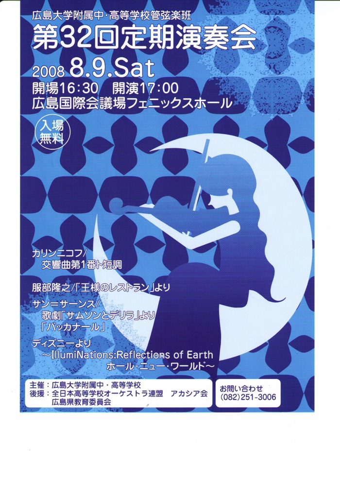 8/9広大附、定期演奏会 音楽 X Facebook はてブ Pocket LINE コピー 2008.07.18 演奏会のお知らせです。8月9日の土曜日、広島大学附属中学高等学校の管弦楽班(管弦楽クラブ)の定期演奏会が国際会議場フェニックスホール(平和公園内)で開催されます。入場無料。皆さん気軽にどうぞ。