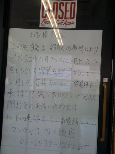 カレーのマンチャゴ閉店 広島 X Facebook はてブ Pocket LINE コピー 2008.11.08 ひろでんビル一階(ひろでん己斐駅)のマンチャゴが店をたたんでいました。張り紙には「この度、当店は諸般の事情により平成20年10月25日(土曜)PM 8:00をもちまして営業を終了することになりました。…(以下略)」とありました。店が営業を始めたのは今年3月だったはずなので短い期間で終わってしまいました。