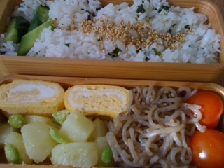 今日の弁当は卵焼き、じゃがいも、糸こんにゃく、挽肉、トマトなど。寒い日は「弁当と、インスタントみそ汁」これがいいんです。