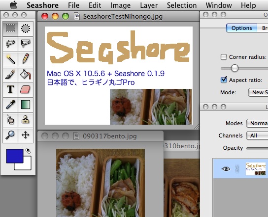そこで方針を変えて軽量版ソフト「Seashore」へ挑戦。Seashore 0.1.9をダウンロードして起動。起動は一瞬。動作も軽い。絵をかいても文字かいても安定。レイヤー使用可能。GIMPでの苦戦が嘘のよう。ブラシツールにPressure sensitiveの項目もあり後日タブレット挑戦予定。参考記事はSeashoreを日本語化すると、ImageWell と GIMP、SeaShoreと、高機能な画像編集ソフト。GIMPとSEASHOREだ。など。