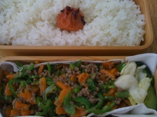 今日の弁当は、にんじんとピーマンとひき肉のいためもの。メモ3点、電気自動車、インド風レストラン、西広島タイムス。