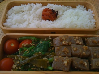 今日の弁当はトマト、こんにゃくとしょうが、ほうれん草など。