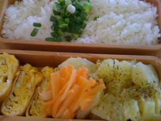今日の弁当は卵焼き、こふき芋、にんじん、など。