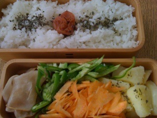 今日の弁当はピーマン、にんじん、ハム、じゃがいもなど。