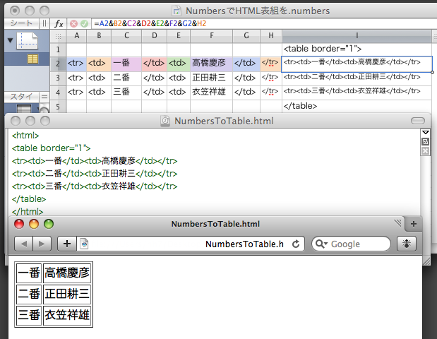 など以上(1)(2)(3)(4)の4つくらいでしょうか。僕の1995年頃の記憶ではAppleWorksでHTMLの表を作る方法を雑誌か掲示板で知ったので、今のNumbersで再現します。添付した図版も参考にどうぞ。