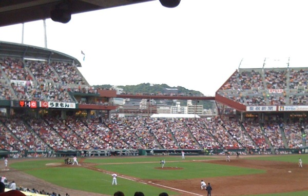 初めて行きましたマツダスタジアム。本日の小雨の巨人戦。試合は巨人が勝って残念だったけど球場は非常に楽しめる作りでありました。広島駅から徒歩約10分の距離は、小雨だったけどあまりつらくない長さでした。午後1時半の試合開始予定なのに12時前に早めに行きました。で、12時前でもすごい人の列。早くも公式グッズ販売店は入り口外の行列が20人。1時頃には雨も強くなっていて、試合中止か決行かわからない状態なのに結構な来場者の数。すごいものです新球場の効果。食べ物は豊富(おでん、フランクフルトはおいしくはなかったけど許しましょう。)小雨のため試合開始後にも徐々に人が増えてきて、3万人収容のスタジアム、8割は埋まっていた気がします。僕はプロ野球を普段見てないわけですが、僕もふくめた「熱いカープファンでない軽い野球ファン」をどう集めるかが球場経営の大事なところなんです。軽い野球ファンにとっては新球場の、広い通路とかきれいなトイレとか前後間隔が広いイスとかが大事なわけですね。(マツダスタジアムの写真は、「雑記帳@ F-Page広島」マツダスタジアム見学会(1)とその続き記事が参考になります。公式サイト以上にわかりやすい写真が豊富です。) さらに望むならばサッカーの試合のように選手紹介のパンフレットが(白黒で十分)あるといいな、と思いました。(本日双眼鏡で観察したところ、カープの応援団はトランペット10人くらいと、太鼓一人。トランペットの2人は赤いトランペットを持った女性奏者の様でした。気のせいか去年よりもトランペット陣の演奏がうまくなっているような印象。)