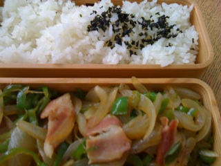 今日の弁当は玉ねぎ、ピーマン、ベーコンのオイスターソースいため。