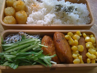 今日の弁当は水菜と小魚のサラダ、さつまあげ、ポテト、とうもろこし。