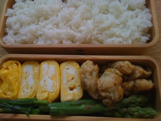 今日の弁当はアスパラガス、卵焼きなど。