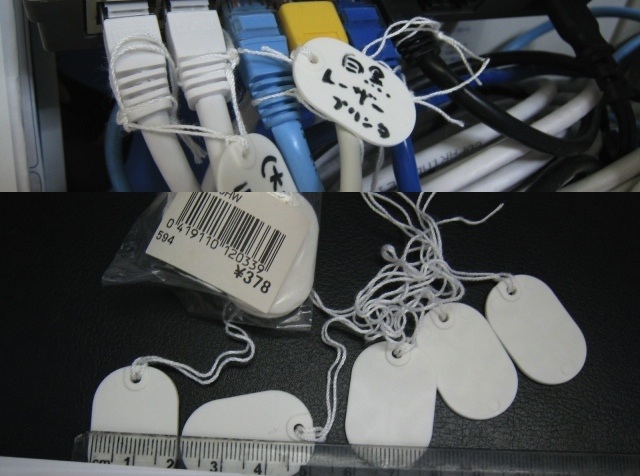 (おまけ。写真は最近マツモトムセンで買った線の名札「カラーエフ」。ガムテープみたいにべとつかないし名前も書けて電源とかLAN配線によさそう。この大きさ20枚で378円)