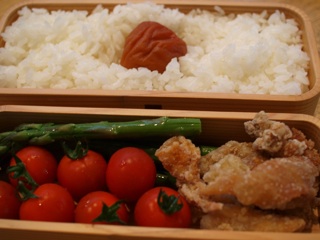 今日の弁当は鶏肉、トマト、アスパラガスなど。