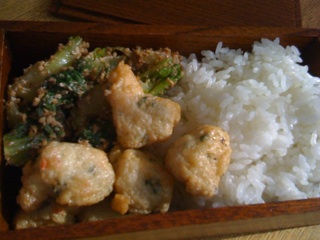 今日の弁当はエビのちぎり揚げ、チンゲンサイなど。
