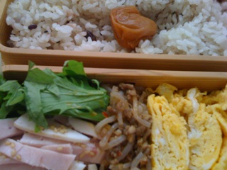 今日の弁当はハム、水菜、糸こんにゃく、卵焼きなど。