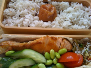 今日の弁当は鮭、トマト、枝豆、きゅうり、など。