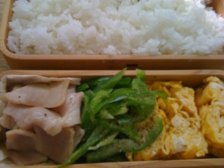 今日の弁当はピーマン、ベーコン、卵焼きなど。