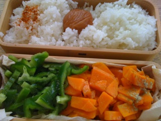 今日の弁当は、ピーマンとにんじんと梅干し(それだけ)です。