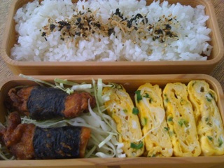 今日の弁当は卵焼き、のり巻きチキン、キャベツ。