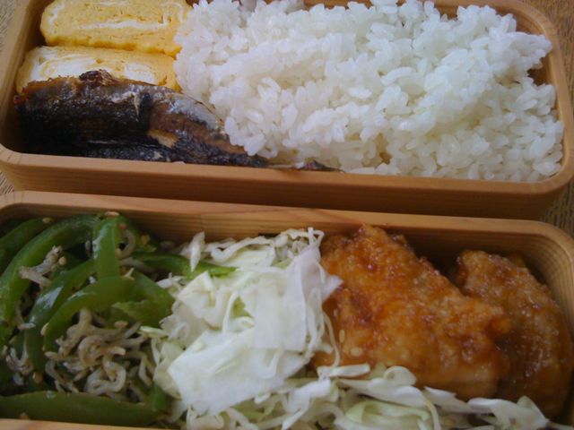 今日の弁当はチキン、キャベツ、卵焼き、ピーマン。