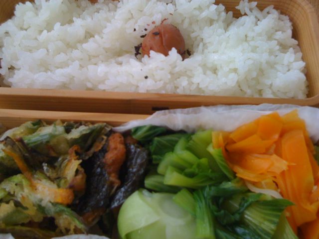 )は天ぷら、にんじん、ちんげん菜、梅干し。