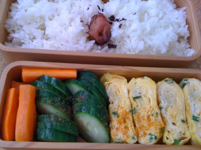 今日の弁当は卵焼き、きゅうり、にんじん。