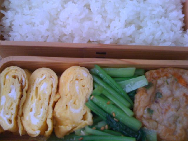 今日の弁当は、卵焼き、小松菜、魚ねりもの。