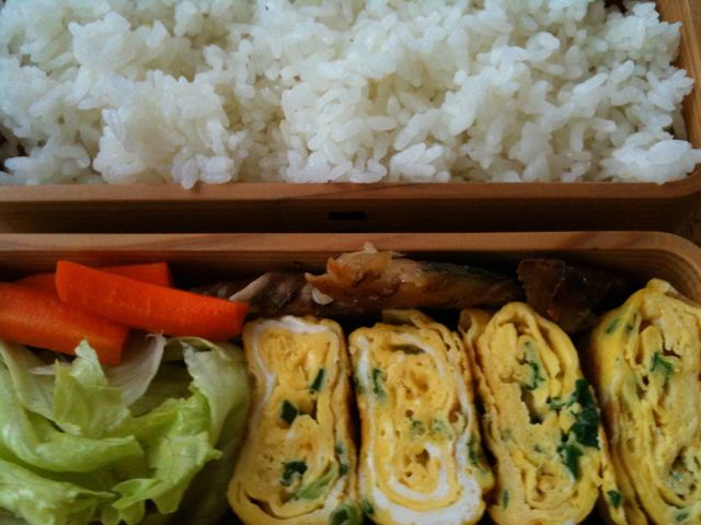 今日の弁当はサバ、レタス、にんじん、卵焼き。