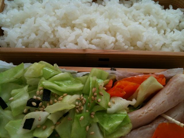 今日の弁当はキャベツ、塩昆布、ごま、ハム、にんじん。(昨日に続いてキャベツ)