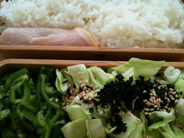 今日の弁当はキャベツ、ごま、ハム、しそわかめ、ピーマン。