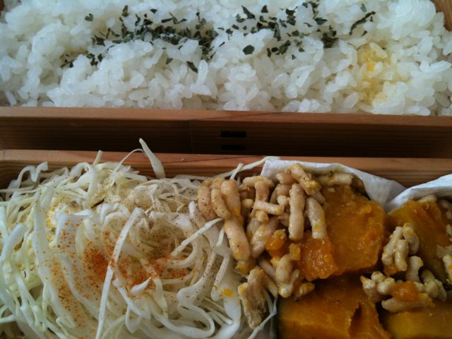 今日の弁当はキャベツ、かぼちゃ、ひき肉。