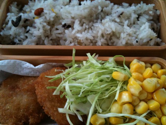 今日の弁当はキャベツ、コーン、ヒレカツ。