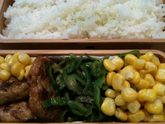 今日の弁当は、とうもろこし、魚ねりもの、ピーマン。