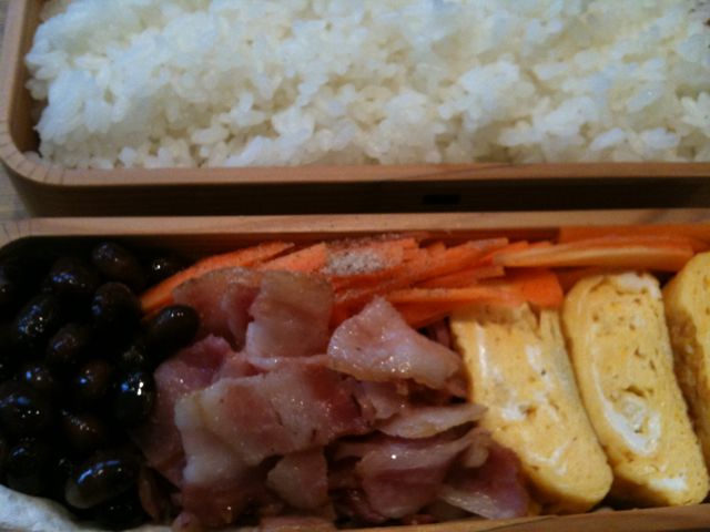 今日の弁当は煮豆、ベーコン、にんじん、卵焼き。
