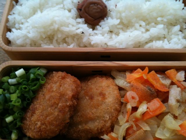 今日の弁当は、ねぎ、ヒレカツ、玉ねぎとにんじん。