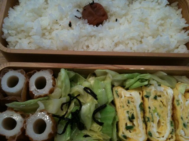 今日の弁当は、塩昆布キャベツ、ちくわ、卵焼き。もはや塩昆布キャベツが週に3回くらい登場する常連おかずです。