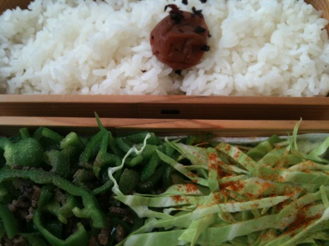 今日の弁当はピーマン、ひき肉、キャベツ。