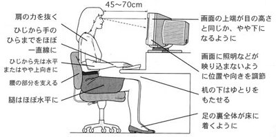 コンピュータ使用時の姿勢も大切です。下の図を参考にして自分の姿勢を調節してみてください。中でもすぐ実践できて有効なのは、椅子を高くすること、画面の高さを下げること、キーボードの高さを下げることだと思います。