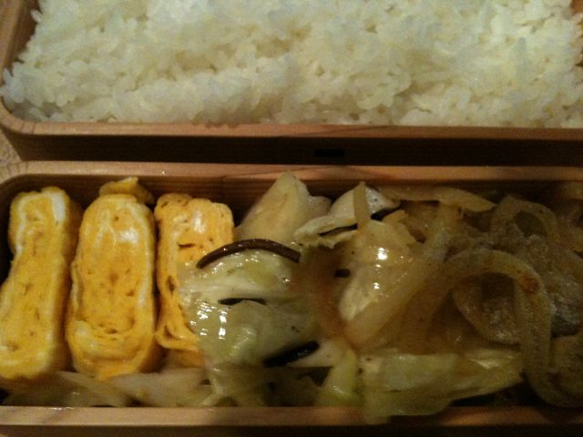 今日の弁当はキャベツと塩昆布、玉ねぎカレー味、卵焼き。
