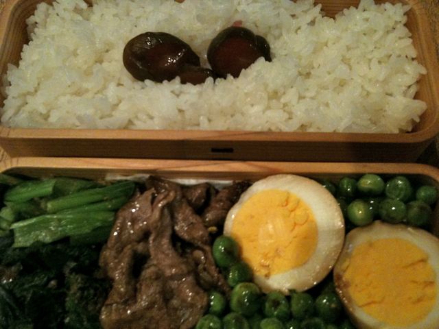 今日の弁当は、グリーンピース、牛肉バター炒め、ほうれん草、柴漬け、ゆで卵。