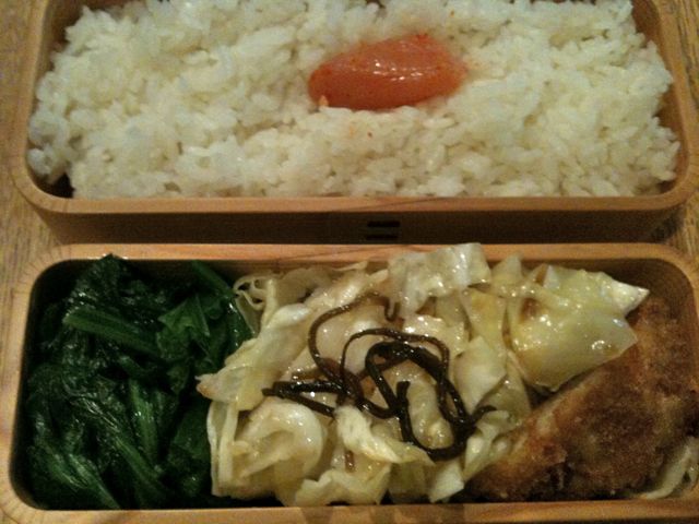 今日の弁当はトンカツ、ほうれん草、キャベツ、明太子。