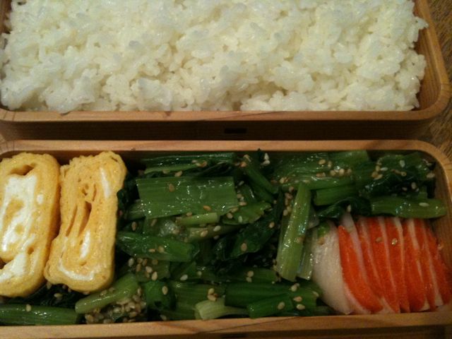 今日の弁当は卵焼き、小松菜、大根とスモークサーモン。