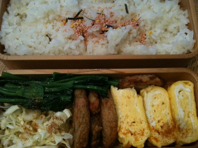 今日の弁当は卵焼き、ほうれん草、キャベツ、練り物。