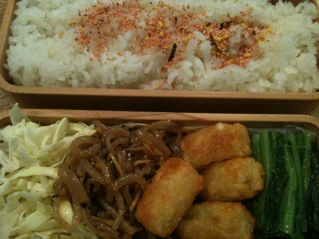 今日の弁当は小松菜、ハッシュポテト、キャベツ、こんにゃく。