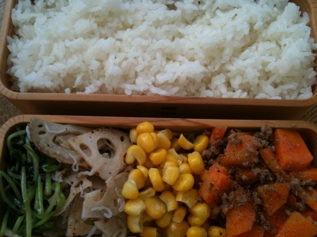 今日の弁当は、豆苗(とうみょう)、れんこん、とうもろこし、にんじん、ひき肉。昨夜は広島に住むtwitterの利用者どうしで「桃屋のラー油」情報が熱く飛び交っていました。桃屋「辛そうで辛くない少し辛いラー油」です。