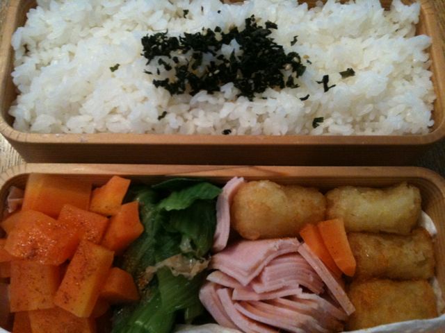 今日の弁当は、ハッシュポテト、ちんげん菜、ハム、にんじん。
