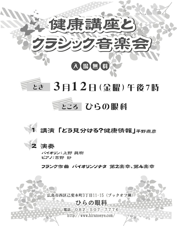 3月12日、演奏会 音楽 X Facebook はてブ Pocket LINE コピー 2010.03.07 3月12日金曜日、夜7時から「健康講座とクラシック演奏会」を開きます。「無料」です。 場所は広島市西区己斐本町、ブックオフ横の「ひらの眼科」内。演奏はバイオリン上野眞樹ピアノ吉野妙という豪華メンバーです。講演は平野が「どう見分ける?健康情報」というテーマで10分程度話をします。ひらの眼科、地図もどうぞ。ぜひお越し下さい。